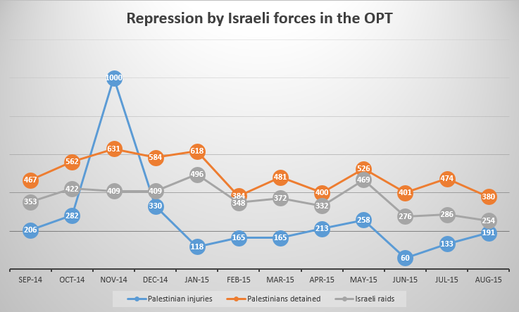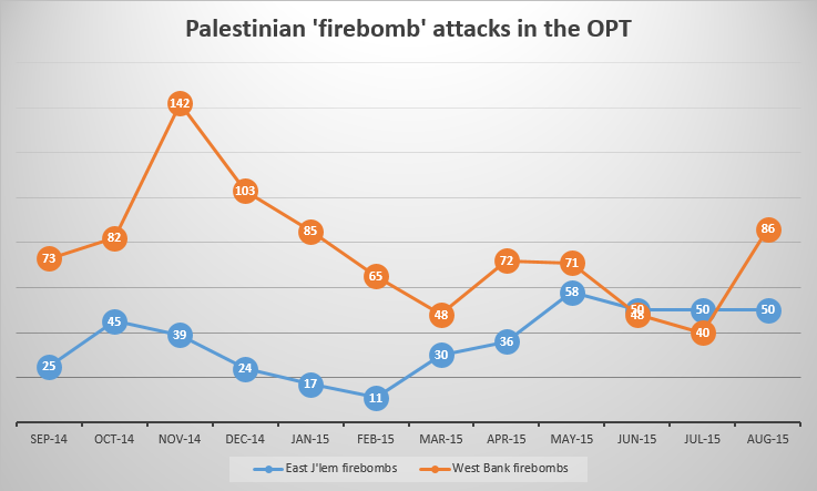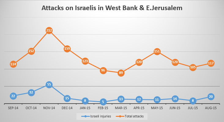 Over a 12-month timespan from September 2014 to August 2015 inclusive (see Graph 1), the number of Palestinian attacks in the West Bank does vary, but has tended to range at between 100-150 incidents per month (targeting both occupation forces and settlers).