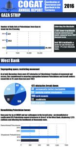Thus, in order to demonstrate the real nature of COGAT’s ‘mission’ in the oPt, I have worked with New York-based designer Rachele Richards to produce this update on the unit’s activities in 2016. It is based on a COGAT monthly report infographic, and the data is from UN OCHA (here and here).